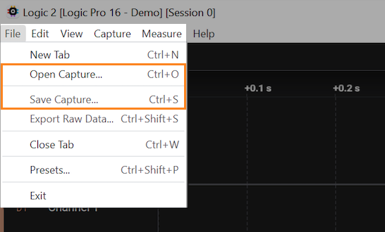 To save your current capture tab, click File > Save Capture. To open an existing capture file (.sal file format), click File > Open Capture.