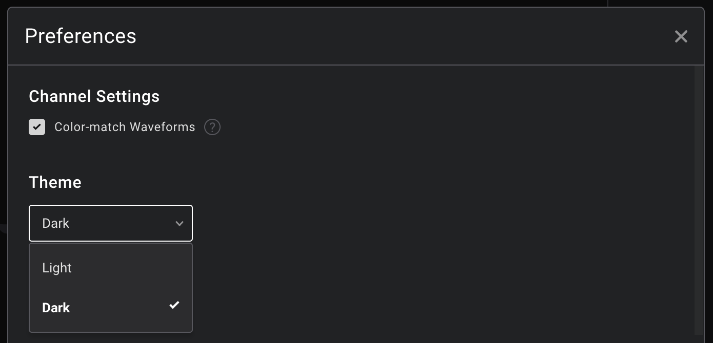 The color theme for the Logic 2 software can be adjusted from within the Preferences window, which can be reached by clicking the Options button (3 lines) at the bottom-right of the software.
