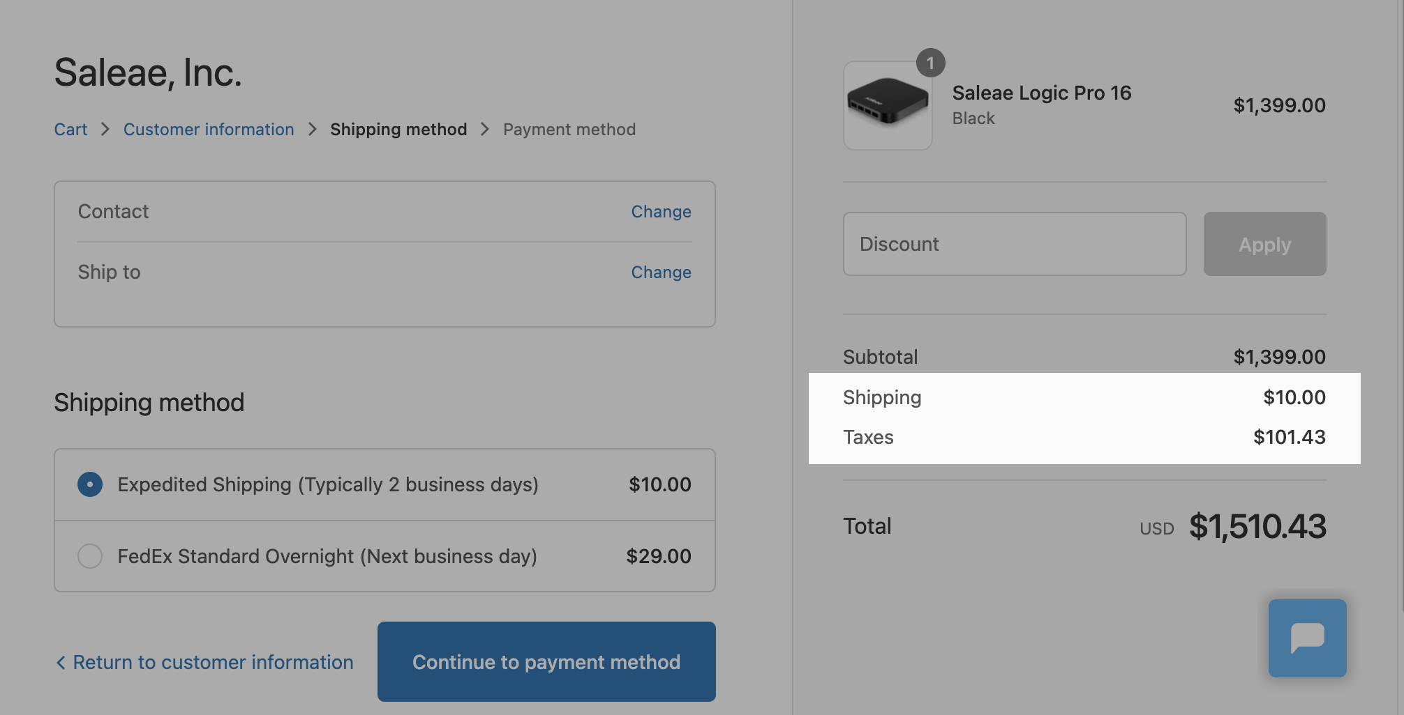 To check the cost of shipping and taxes, follow the steps in the support article below to place an online order. When you reach the Checkout page, enter your contact information and shipping address and click “Continue to shipping method” to reach the “Shipping method” page. From there, you can select your preferred shipping method and can view the shipping cost and taxes.