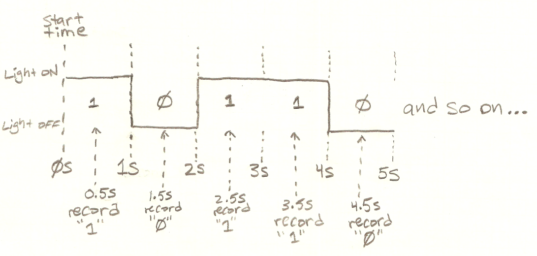 In the middle of each second (.5 seconds after the new bit is on the bus and .5 seconds before the next one), your friend writes down the value—1 if the light is on, 0 if the light is off.